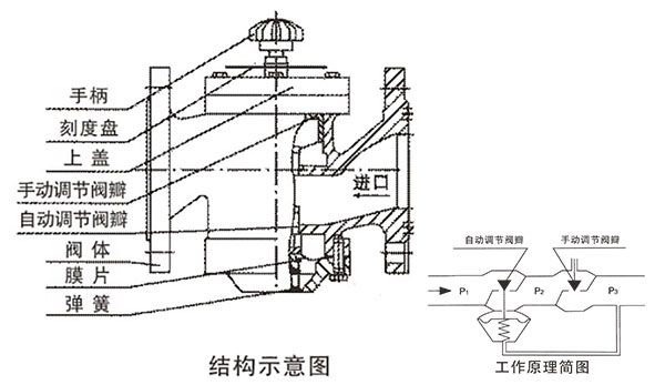 該閥主要由閥體,上下蓋、自動調(diào)節(jié)閥瓣、手動調(diào)芾閥瓣,膜片和彈簧等組成,如圖所示